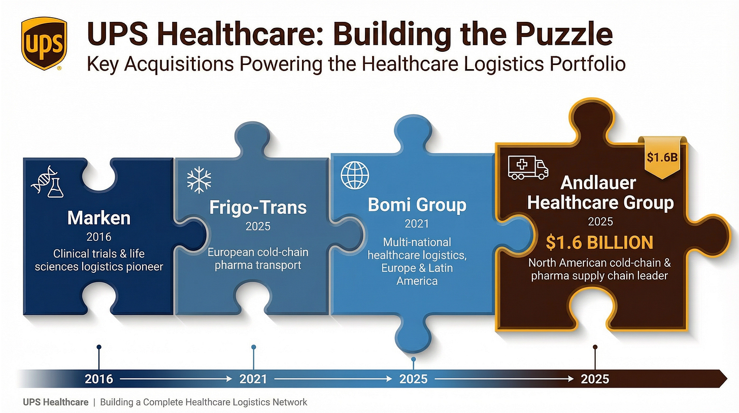The most interesting difference is strategy is UPS and DHL’s “buy” vs FedEx’s “build” strategy. UPS has made 3 large acquisitions in 2025 alone while FedEx has not announced any acquisitions, but has publicly shared revenue milestones including $400 million in new annualized revenue in 2025, and $500 million in wins in 2024.
