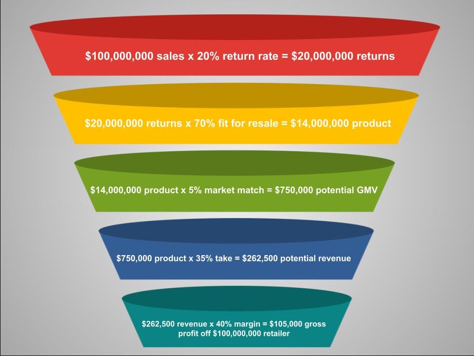 What percentage of those returns are suitable for resale? Let’s be generous and say 70% of that. With all the various old collections, off season, what is the probably that a buyer and seller of the same SKU match? Perhaps 5%, or $750K. Of $750,000 GMV how much in fees might the software platform take? If they are managing the sales process, logistics, and marketing it might be high - as much as 35%. If they are provided the typically low margin logistics services, then let’s assume that they have a blended gross margin of 40%. Our final numbers look like this: