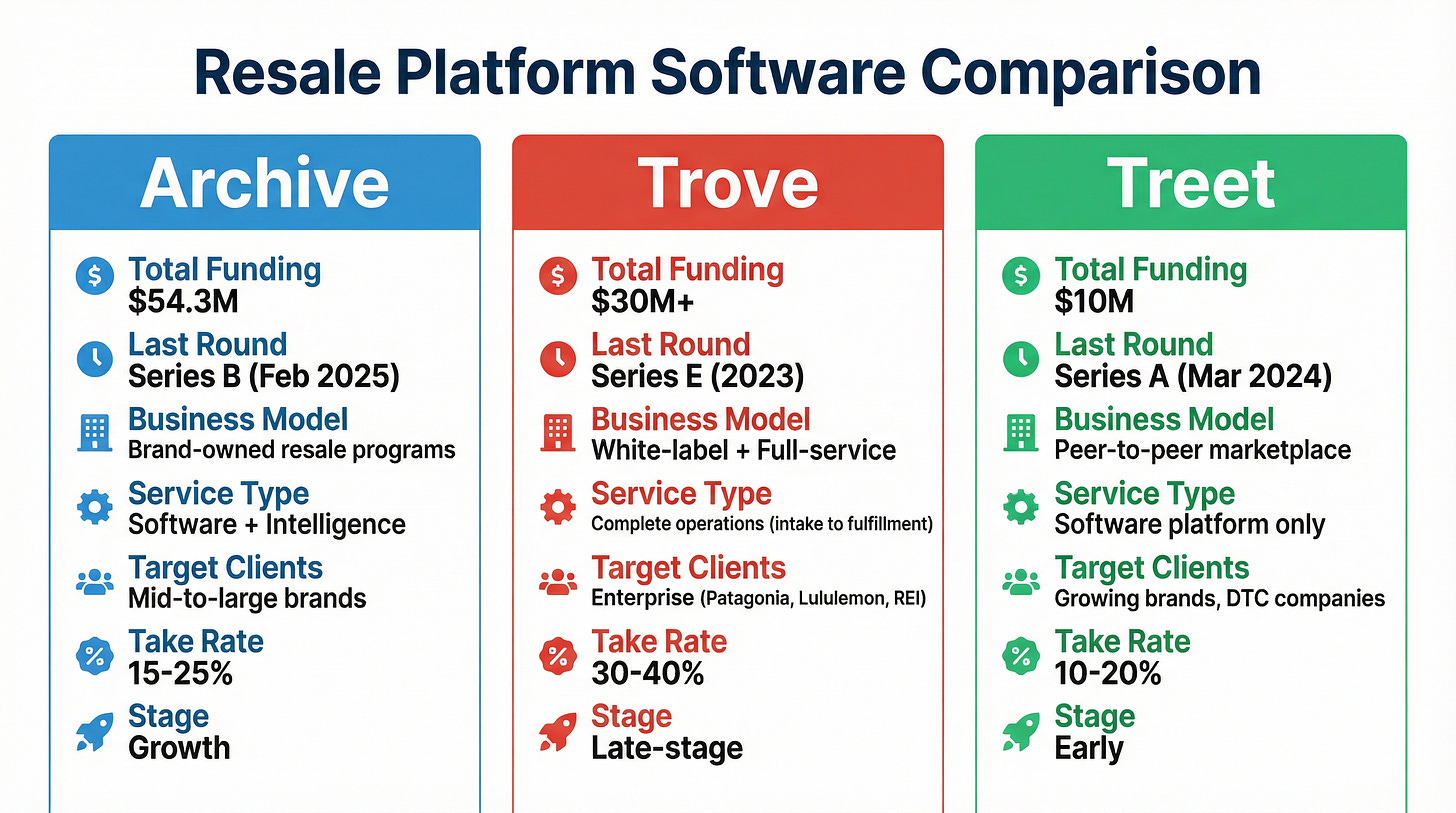 Companies like Archive, Trovet, and Treet have raised over to $200m from VCs to solve the even-smaller-problem of brands and retailers needing software to help them create a either a marketplace for their customers to resell their used products, or a a secondary eCommerce front to sell used and refurbished products directly.