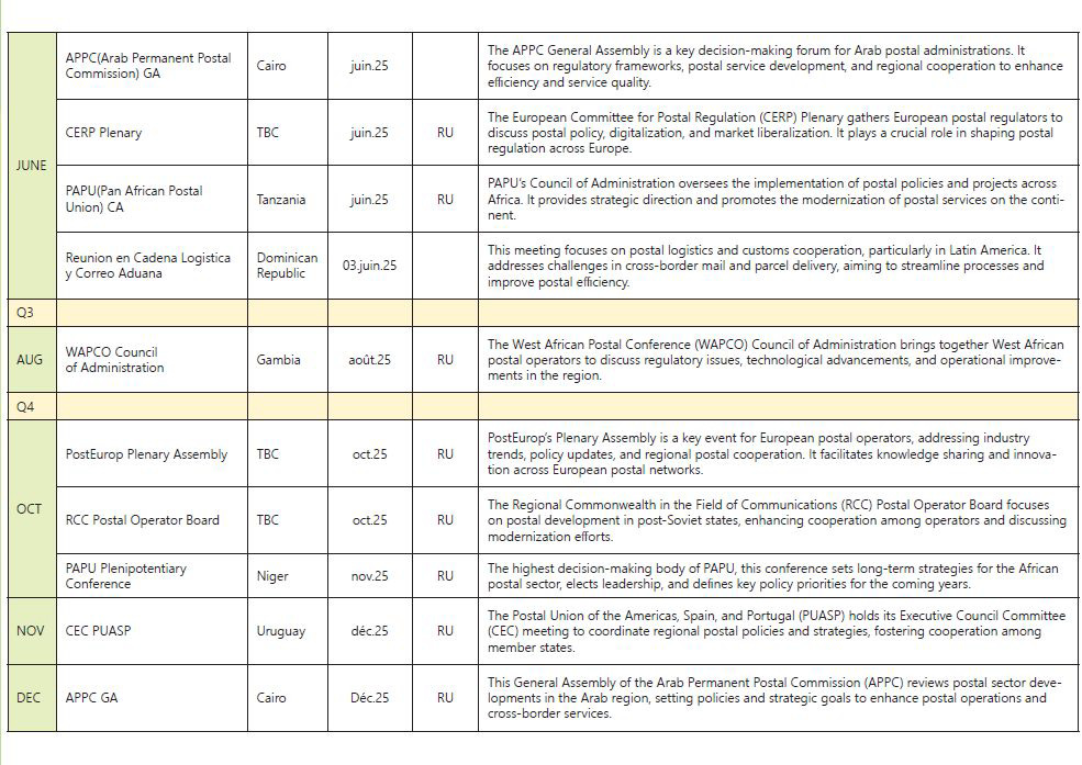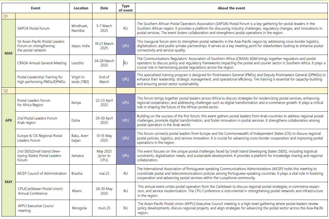 Here is a quick update of the UPU event calendar for 2025. Besides direct UPU events, there are also regional operator events.